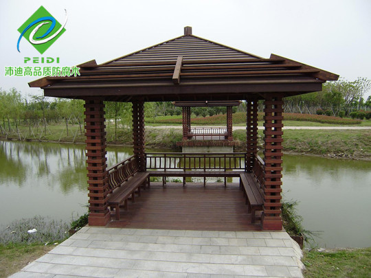 印尼菠蘿格是該木材品種最好的一種,該木材密度大、質(zhì)量重、硬度大、質(zhì)地堅韌,材質(zhì)均一光澤好,關(guān)鍵是沒有氣味,花紋好看,色澤時間久了紅紅的,顯得高貴典雅。自從印尼菠蘿格防腐木材名聲鵲起以后,其用途就開始被人們廣泛應(yīng)用。由于菠蘿格木材不僅美觀而且耐久性好,所以它的木材可以用于建造木結(jié)構(gòu)經(jīng)過,常見于防腐木亭子、廊架、花架、防腐木地板等,也可以用于高檔戶外家具的制作。上圖為菠蘿格木材打造的防腐木亭子,木材本身的顏色配合古典的結(jié)構(gòu)特色,讓整個建筑顯得十分有品味,更襯托了風(fēng)景的美麗。
