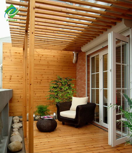 陽(yáng)臺(tái)是家庭住宅中不可缺少的一部分,它是老人小孩的活動(dòng)場(chǎng)所,因而要有防滑功能;也是洗曬的工作場(chǎng)所,因此要有防潮,防水,防蛀;也是談笑聊天休息打盹的休閑娛樂(lè)場(chǎng)所,所以格調(diào)要美觀。既要美觀又要安全性強(qiáng),所以防腐木更多的成為了大眾裝修的首選。
