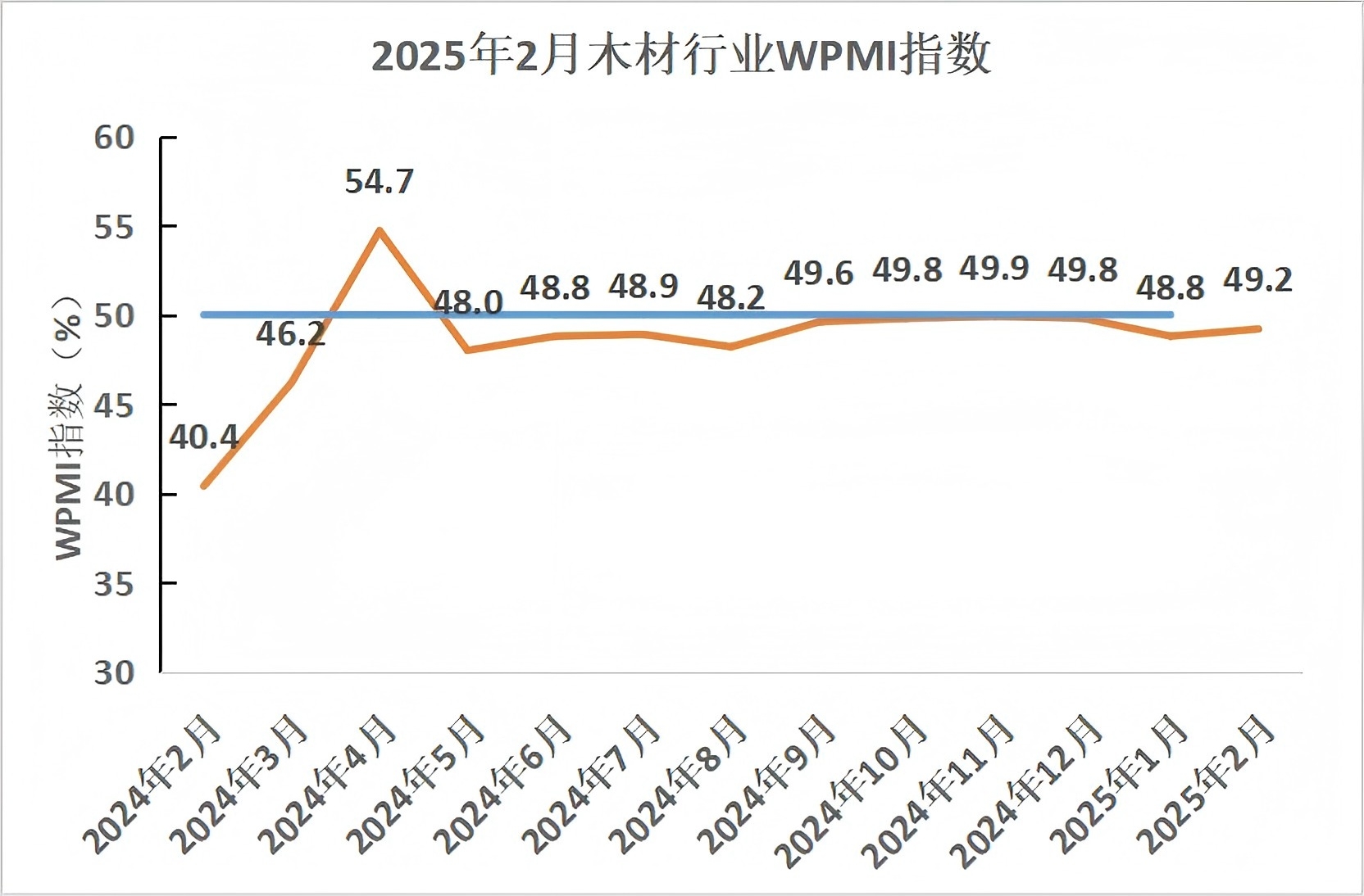 中國木材保護工業(yè)協(xié)會發(fā)布的2025年2月木材行業(yè)采購經(jīng)理指數(shù)(WPMI)為49.2%,較上月48.8%上升0.4個百分點,表明木材行業(yè)形勢有所上升。 從分類指數(shù)看,在構成WPMI的5個分類指數(shù)中生產(chǎn)指數(shù)、新訂單指數(shù)和供應商配送指數(shù)均高于臨界點(50%),原材料庫存指數(shù)和從業(yè)人員指數(shù)外低高于臨界點。 生產(chǎn)指數(shù)為55.4%,較上月上升0.4個百分點,高于臨界點,表明木材行業(yè)生產(chǎn)有所增多。 新訂單指數(shù)為50.0%,較上月下降0.7個百分點,處于臨界點,表明木材行業(yè)市場需求持續(xù)增加。 原材料庫存指數(shù)為49.4%,較上月下降1.3個百分點,低于臨界點,表明木材行業(yè)主要原材料庫有所減少。 從業(yè)人員指數(shù)為42.8%,較上月上升2.1個百分點,低于臨界點,表明木業(yè)企業(yè)用工景氣水平有所下降。 供應商配送時間指數(shù)為54.2%,較上月下降1.5個百分點,高于臨界點,表明木材原材料供應商交貨時間持續(xù)增加。 總體來看,2月份木材行業(yè)在春節(jié)后呈現(xiàn)出一定的復蘇跡象,生產(chǎn)活動和市場需求均有所回升。新訂單指數(shù)為50.0%,較上月下降0.7個百分點,表明市場需求雖有所波動,但整體保持穩(wěn)定,仍處于擴張邊緣。原材料庫存指數(shù)為49.4%,較上月下降1.3個百分點,表明企業(yè)可能在春節(jié)后根據(jù)生產(chǎn)需求調整庫存水平。從業(yè)人員指數(shù)為42.8%,較上月上升2.1個百分點,但仍低于臨界點,反映出木業(yè)企業(yè)用工景氣水平有所下降,但降幅有所收窄。供應商配送時間指數(shù)為54.2%,較上月下降1.5個百分點,表明木材原材料供應鏈效率有所下降,企業(yè)需關注原材料供應的及時性。企業(yè)需加強供應鏈管理,優(yōu)化庫存配置,以應對可能出現(xiàn)的供應波動。隨著國家政策的持續(xù)推進和市場需求的逐步回暖,木材行業(yè)有望在未來保持穩(wěn)定向好的發(fā)展態(tài)勢。企業(yè)應繼續(xù)保持信心,提升生產(chǎn)效率,優(yōu)化資源配置,以更好地應對市場變化,推動行業(yè)高質量發(fā)展。 |